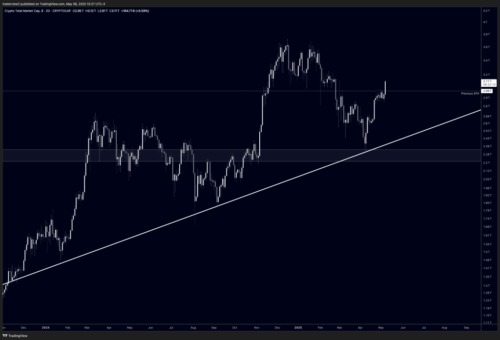 Dom mapped the shift onto higher-time-frame structure, writing that “TOTAL, the total market cap of crypto, has just hit its uptrend it has held over the last 18 months […] This also coincides with the POC of the volume profile since late 2023.”