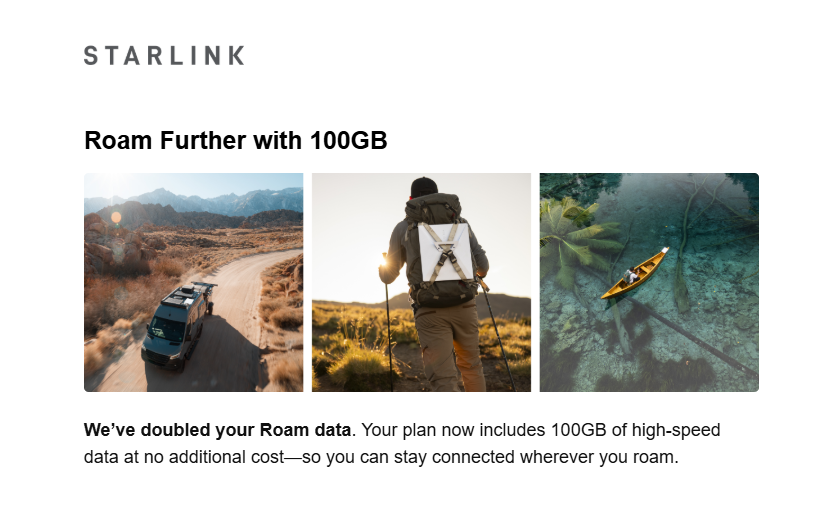 : NEWS: SpaceX's Starlink is upgrading its cheapest, $50-per-month plan by doubling the amount of monthly data from 50GB to 100GB for no additional cost. The Roam 100GB plan can also continue offering satellite internet access, even after the data cap is exceeded. The connection will just be downgraded to speeds under 1Mbps, or what SpaceX calls “unlimited low-speed data.” In contrast, the original Roam 50GB plan required users to pay for additional data at rate of $1 per GB, otherwise SpaceX would cut off the access for the rest of the month.