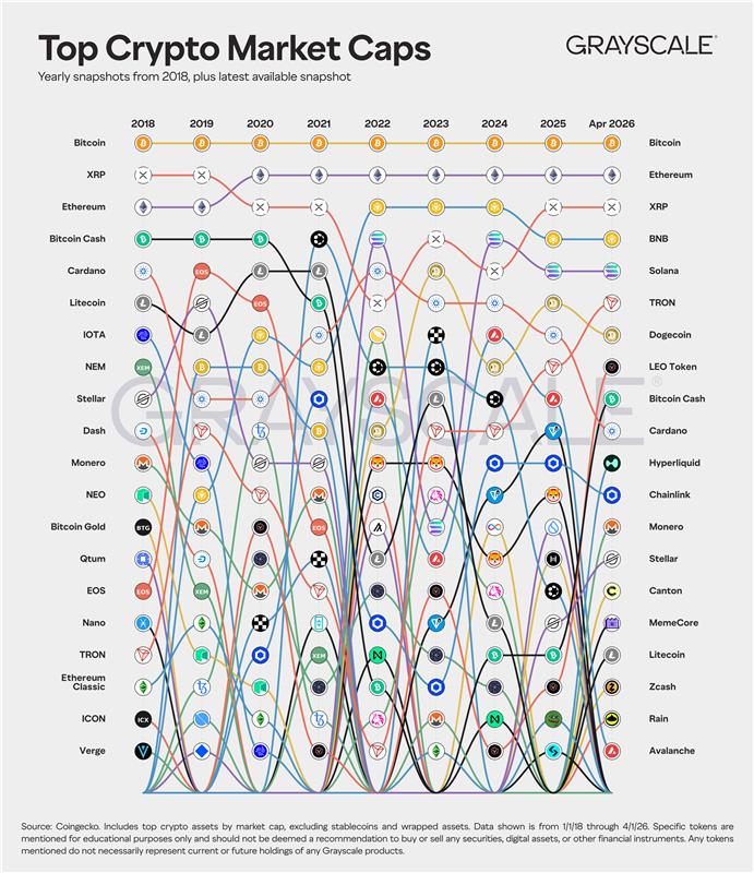 From 2018 to today, top crypto assets by market cap. Who's missing? 2018: $BTC $XRP $ETH $BCH $ADA $LTC $IOTA $XEM $XLM $DASH $XMR $NEO $BTG $QTUM $EOS $NANO $TRX $ETC $ICX $XVG ➡️➡️➡️ 2026: $BTC $ETH $XRP $BNB $SOL $TRX $DOGE $LEO $BCH $ADA $HYPE $LINK $XMR $XLM $CC $M $LTC $ZEC $RAIN $AVAX