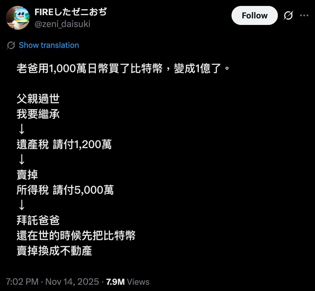 日本網友在 X 平台上的貼文寫出加密貨幣在日本繼承繳稅壓力有多大,甚至希望過世的人「事先換成不動產」。