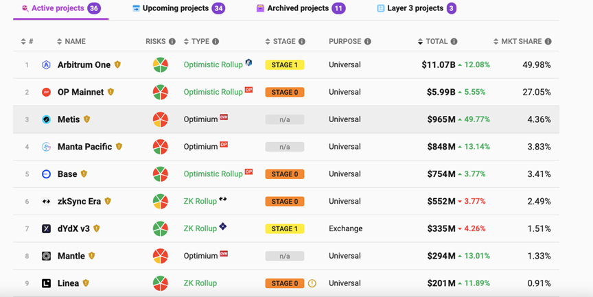 Metis 的惊人涨幅引发了市场的强烈关注,但同时也带来了一些争议。事实上,就在三个月前,Metis 还只是一个基于 Optimistic Rollup 的 layer 2 方案,相比 Arbitrum、Optimism、Base 等L2网络,Metis 的知名度要小得多,甚至不如 zkSync、Starknet、Linea 等。
