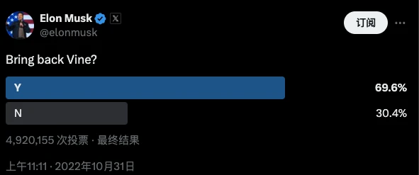 2022 年 10 月 31 日,马斯克在推特发起 民意调查 ,询问是否恢复推特旗下短视频应用 Vine。结果显示, 69.6% 参与投票的用户支持恢复 Vine。投票结果公布后,马斯克随即在 2022 年 11 月 1 日指示推特工程师团队重新启动短视频应用 Vine,并宣布在当年年底前准备就绪,但此后不了了之。