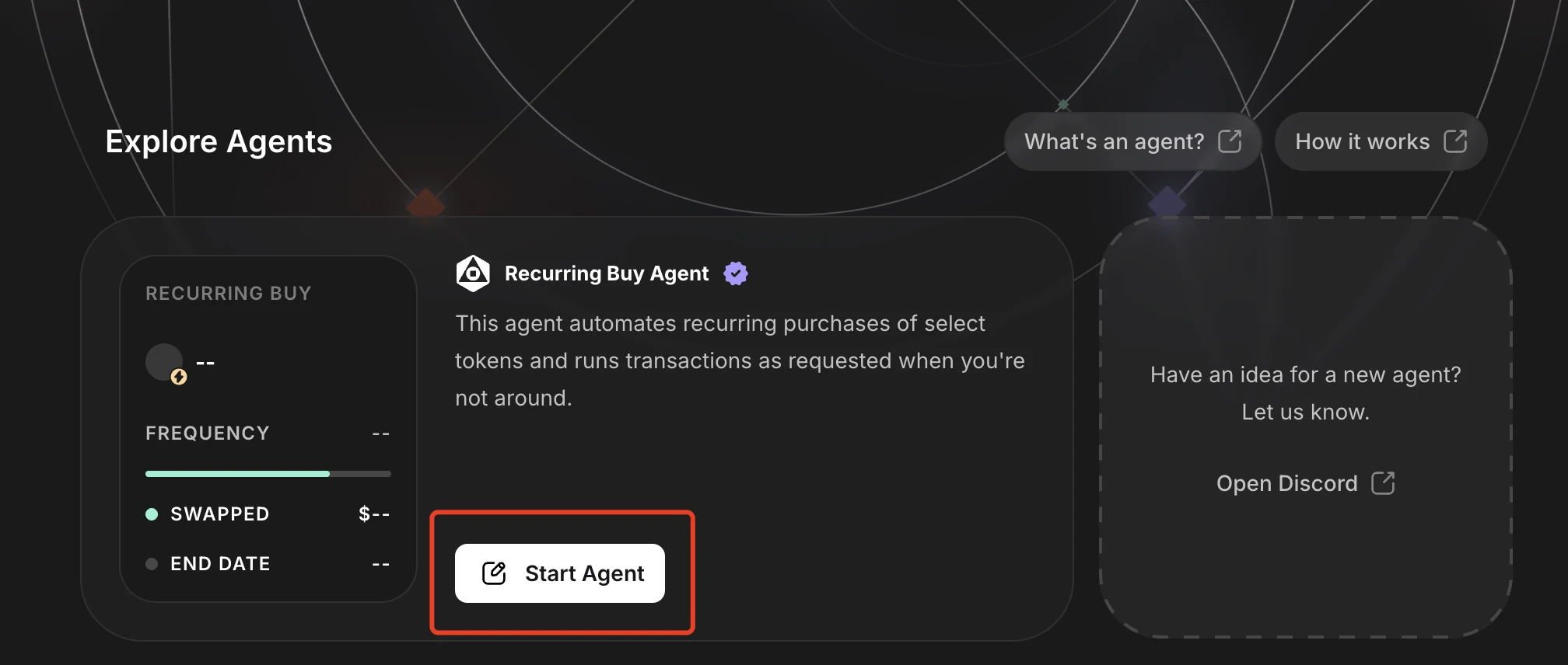 点击“Start Agent”,就可以设置一个自动化代理。然后设置购买币种、购买频率和截至时间或是直到资金用完。这部分任务完成可直接获得 500 积分。