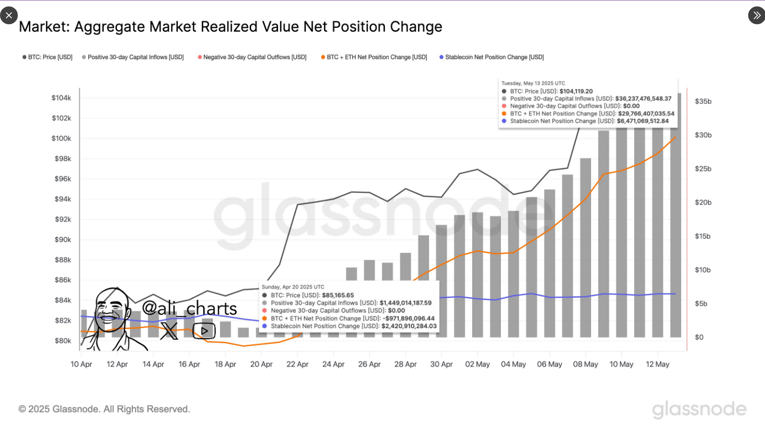 According to a May 14 post on X by crypto expert Ali Martinez, the data comes straight from Glassnode, a leading blockchain analytics firm. Ali highlighted that the market saw $35.05 billion in net inflows over the three‑week stretch.