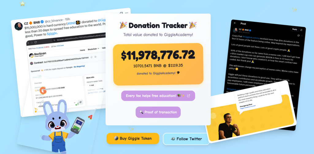 $11,000,000 in hard currency ( #BNB ) donated to @GiggleAcademy in less than 20 days to spread free education to the world. Power to crypto for good, Power to $giggle . https://t.co/jc00i8zVIy pic.twitter.com/P38ikSnDL4