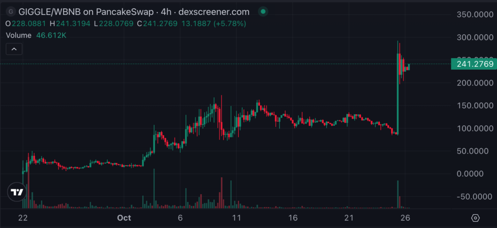 G iggle Fund (GIGGLE) 迷因幣在昨(25)日下午正式於幣安上市,幣價在四小時內一度飆升超 200%,截稿前現報 241.27 美元,市值達 2.4 億美元。