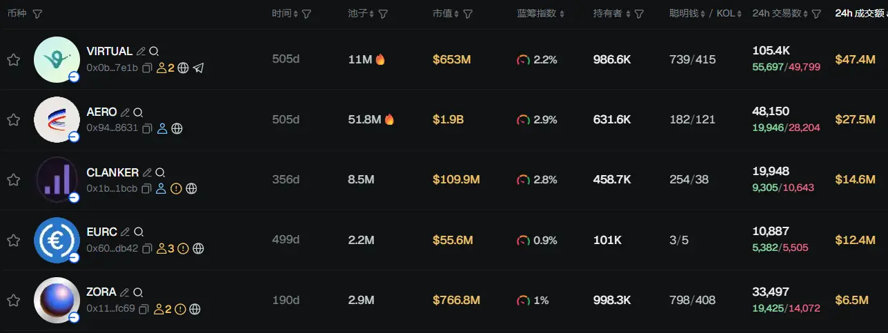 过去 24h Base 热门代币前五依次为:VIRTUAL、AORA、CLANKER、EURC、ZORA