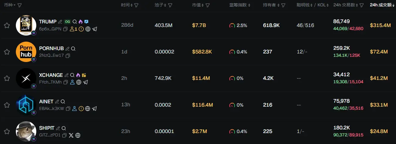 过去 24h Solana 热门代币前五依次为:TRUMP、PORNHUB、XCHANGE、AINET、SHIPIT
