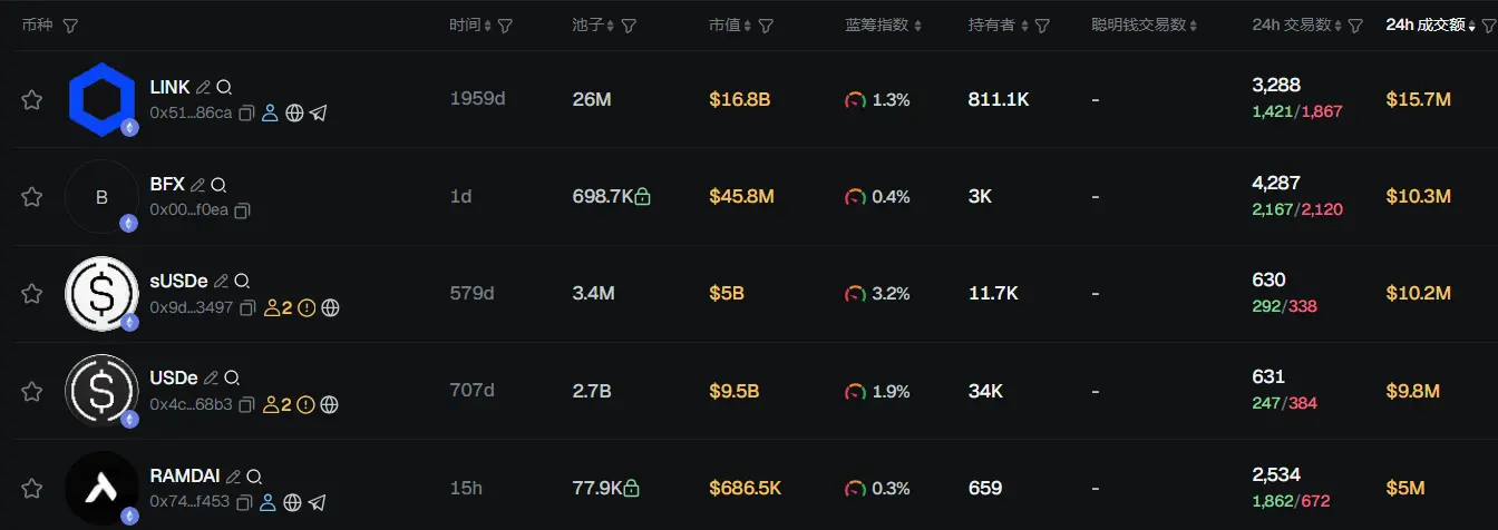 过去 24h ETH 热门代币前五依次为:LINK、BFX、sUSDe、USDe、RAMDAI