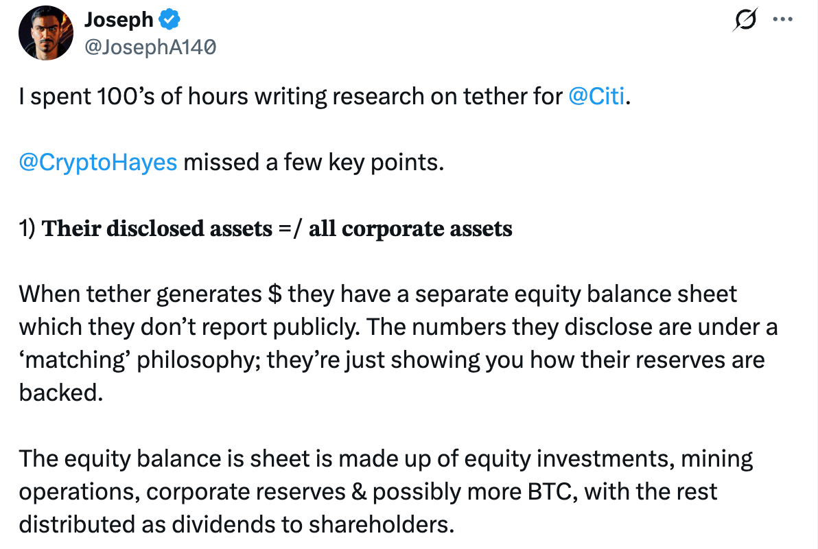 Paolo Ardoino 直接回应之后,Arthur Hayes 也再次进行了回复,但发言多少有些阴阳怪气:“ 你们赚了好多钱啊,嫉妒死我了。 你们有没有具体的分红政策?或者根据资产类型(按其波动性折价)来设定的目标超额抵押率?显然,当你们的负债是美元、资产是美国国债时毫无问题,但如果你们的资产是流动性不佳的私下投资,一旦发生意外情况,人们可能会质疑你们自称超额抵押的说法。”