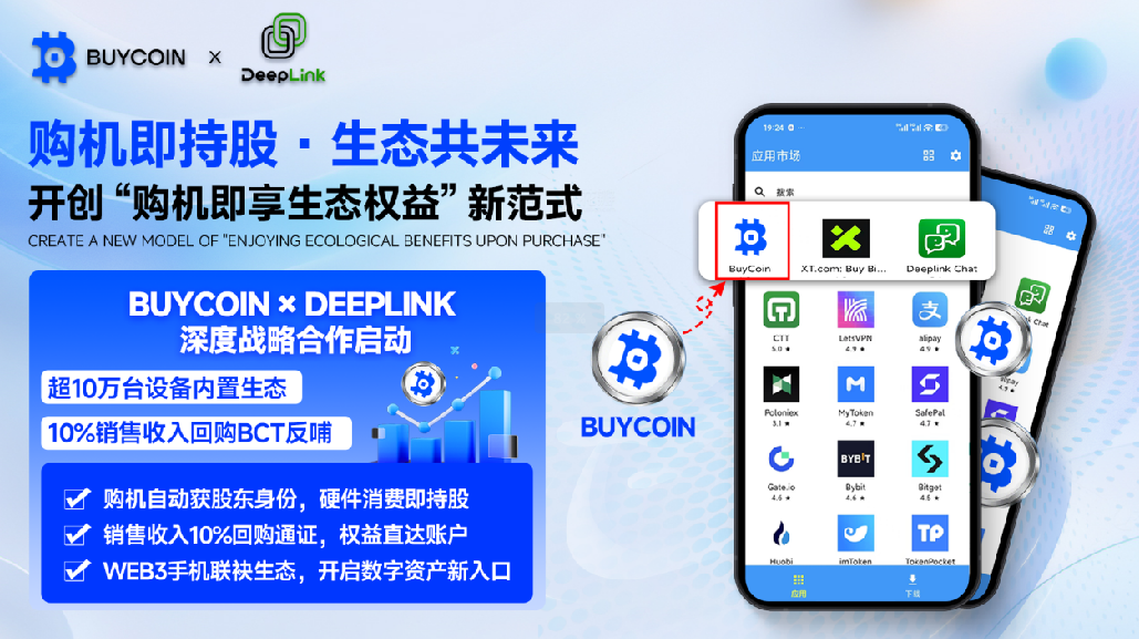 双方宣布,将在超过10万台DeepLink手机中深度预置BUYCOIN生态入口,并联合启动“购机即持股”用户权益计划。当您购入一台DeepLink手机,惊喜远不止于手中这部性能卓越的硬件。其手机销售收入的10%,将用于在二级市场回购BUYCOIN生态通证BCT,并通过智能合约自动分发给对应购机用户。这并非简单的促销,而是一场革命性的创新——“购机即持股”模式。每一笔手机销售,都成为用户与BUYCOIN生态紧密相连的纽带。用户不仅获得了先进硬件,这意味着用户从购买手机的那一刻起,便以硬件成本间接持有BCT,无缝接入生态权益体系,更以极低成本成为BUYCOIN生态的共建者,手握未来财富增长的钥匙。BCT通证,代表着对交易所未来利润的分红权,以及社区治理的话语权,让每一位用户都能共享生态成长红利,实现从使用者到利益共同体的华丽转变。
