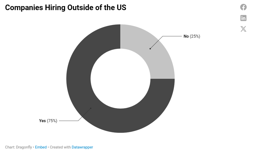 所有接受調查的公司中,無論其規模、階段或融資情況如何,有 75% 在美國以外招聘人才。