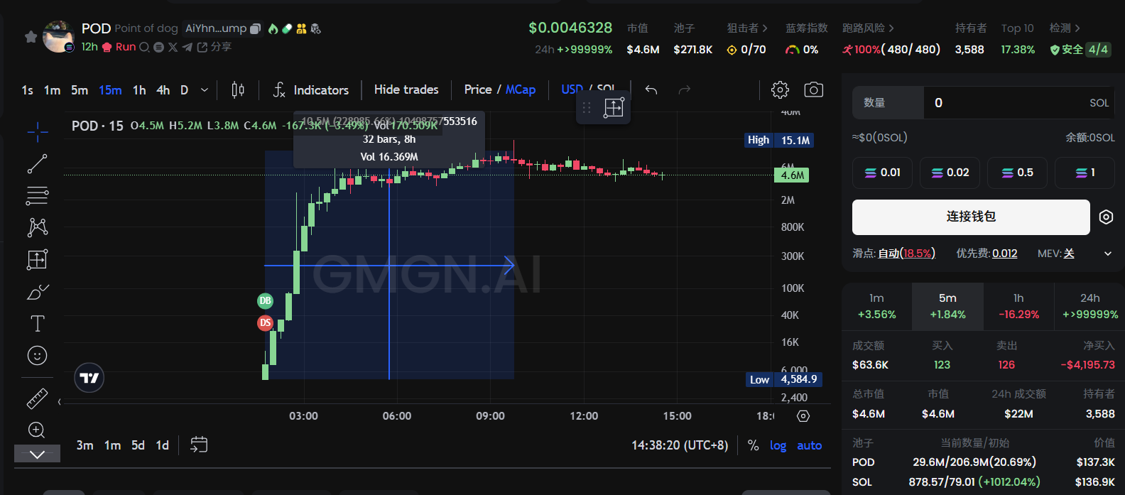 从 Pump.fun 发射后就是熟悉的手法,一路狂拉,上线半天不到最高市值超过 1000 万美元,现回落至 460 万美元附近,上线 12 小时成交额已经有 2200 万美元成交额。