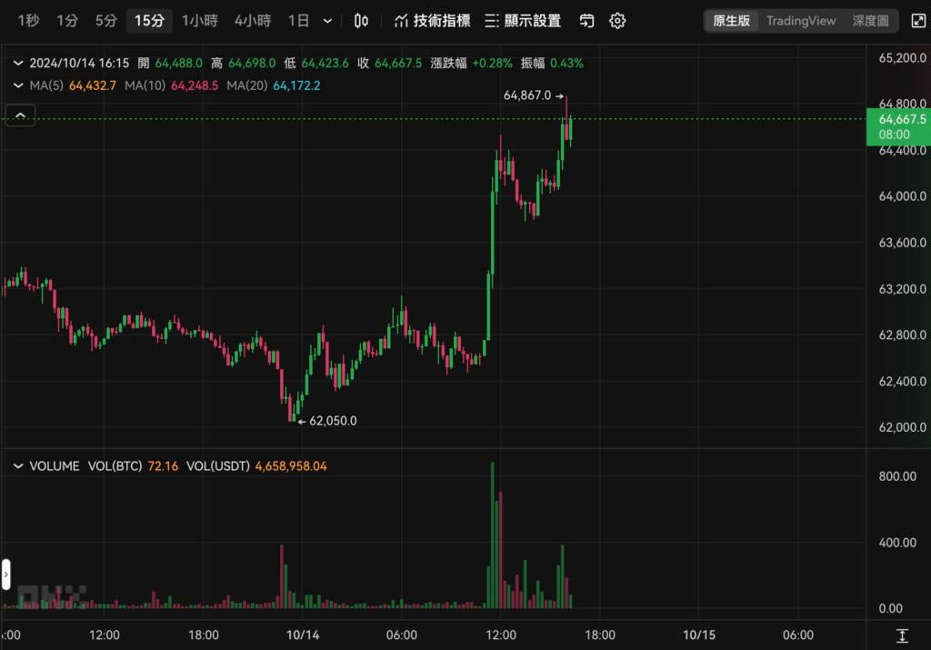 接著在今早 11 時起,又突然從 62600 美元急速拉升,最高上漲至 64,500 美元,刷新本月新高,截稿前更再度攀高 64,867 美元。