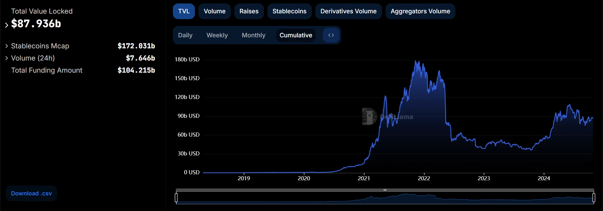 要知道 2020 年 Compound 引爆 DeFi 盛夏以来,数字资产体量迎来长足发展,截至 2024 年 10 月 25 日,链上 TVL 高达 880 亿美元。但相比动辄上万亿美元的可代币化 RWA 资产(债券、黄金、股票、房地产等),这一体量仍显微不足道,因此 RWA 代币化无疑将为链上资产带来强劲的增量动力。