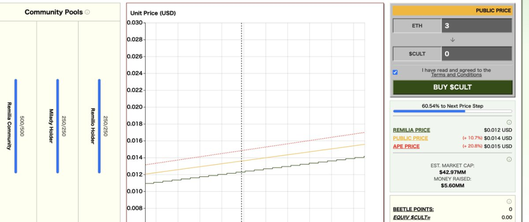 12 月 9 日,Milady Cult 宣布,Milady 创始人 @CharlotteFang 77 发布的预售 Meme 项目 CULT 已进行 TGE。而 Milady 项目早在今年 6 月就宣布了预售 Meme 代币 CULT。当时预售持续 7 天,总计筹集了 5861.8 枚 ETH,价值约 2053 万美元。