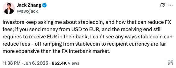 若把舞台限定在 伦敦 ↔ 纽约 ↔ 法兰克福,他并非夸口。问题在于——全球 85% 的跨境流量并不在 G10 这条康庄大道上。阿根廷自由职业者眼里,银行依旧 3 天起步、3% 手续费起跳;肯尼亚商贩给尼日利亚供货,要穿两条 correspondent banking“盘山路”;土耳其进口商周五晚想付订金,遇上银行周末闭门只能干等。在这些被“主流”忽视的角落里,稳定币半年翻三倍的体量,像野草一样疯长。