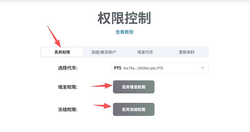 权限放弃是非常简单的,我们只需要在点击放弃权限按钮,并选择要放弃的权限(增发权限与冻结权限要分别丢弃),钱包确认,即可完成