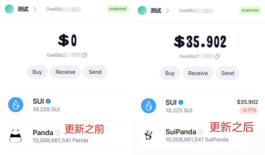 等待半小时后,我们验证一下是否更新成功,首先是钱包里的logo已经发生变化(Suiet钱包更新比较慢,SuiWallet更新较快)