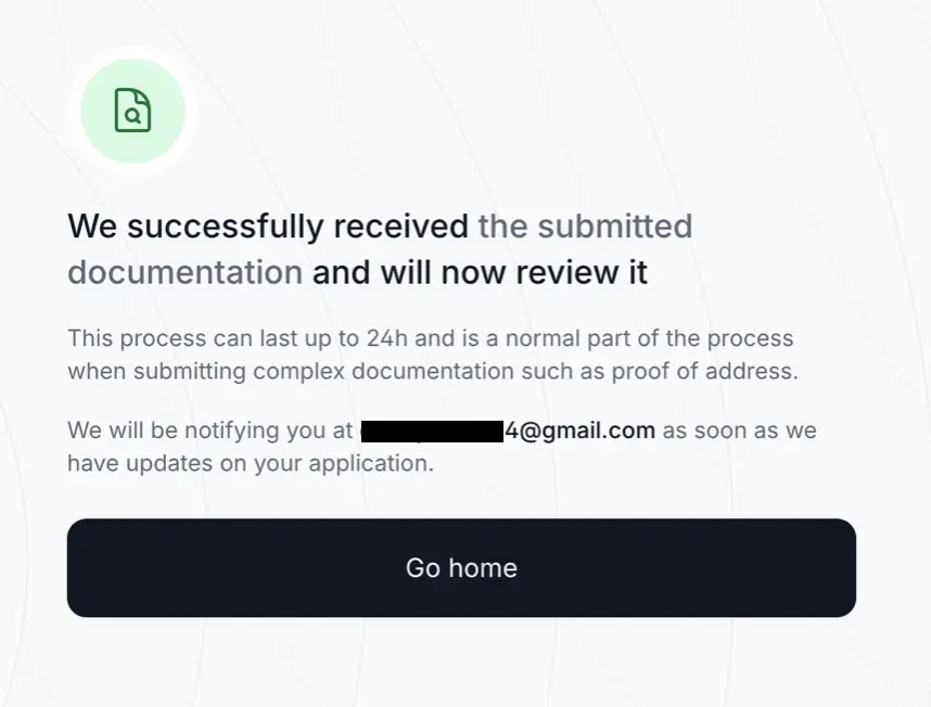 完成人脸识别后,我们再回到电脑上操作,页面会跳到下一个步骤需要上传地址证明。如果收到邮件反馈失败,就再上传其他证明资料尝试。