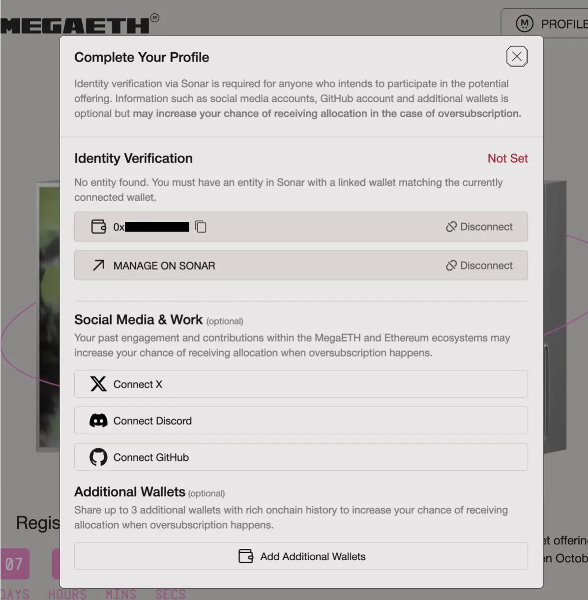 进入 MegaETH 平台的个人资料完善页面,可以先做下面「Social Media & Work」 Twitter、Discord 和 GitHub 的链接。尽量选择交互丰富的账号,因为在 MegaETH 和以太坊生态系统中的过往参与和贡献可能会提高在超额认购时获得分配的机会。