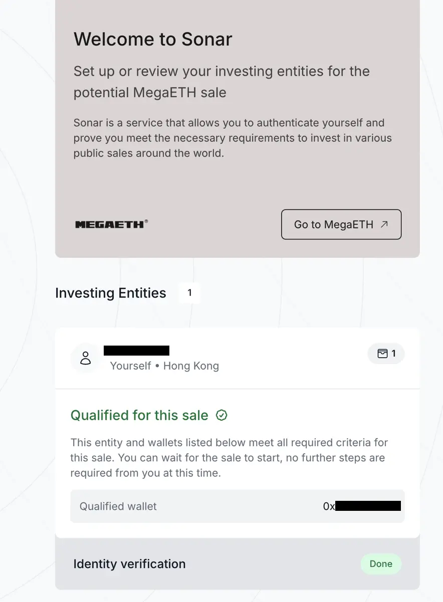 Sonar 上目前最火的 ICO 是 MegaETH,10 月 15 日至 10 月 27 日期间处于注册时间,注册截止时间还有 6 天。完成 KYC 身份验证步骤比较多,但在资料完善且顺利的情况下几乎是秒通过的,如果需要等待的话则是在进行人工审核,需要等待至少 1-3 天,因此尽早完成 KYC。