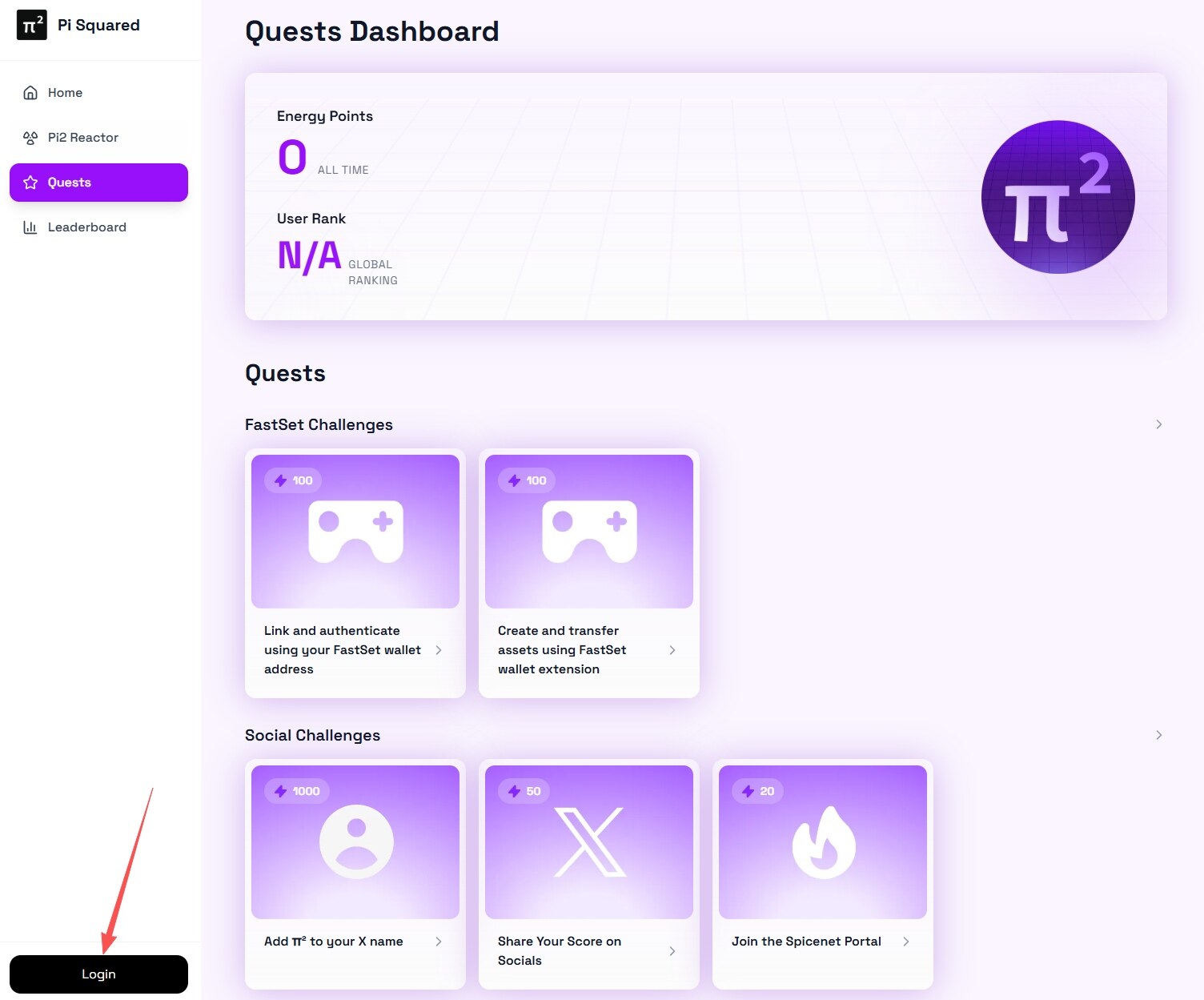 STEP 2. 在 Pi Squared 页面左下角点击用户登录,通过谷歌邮箱进行登录后绑定 X 账户、Discord、钱包。