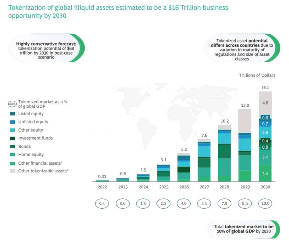 波士顿咨询集团(BCG)预测,到2030年,RWA赛道的市场规模将达到16万亿美元,远超当前整个加密市场总市值。如果实现10万亿美元的中值预测,RWA行业价值将比目前增长54倍以上。