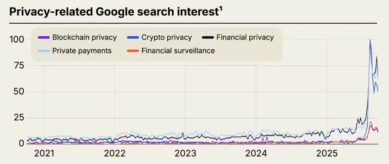 Zcash 的突然暴涨,似乎反映了加密文化内部的转变。正如 a16z《2025 加密状态报告》指出,近期谷歌上对隐私相关词的搜索兴趣激增。