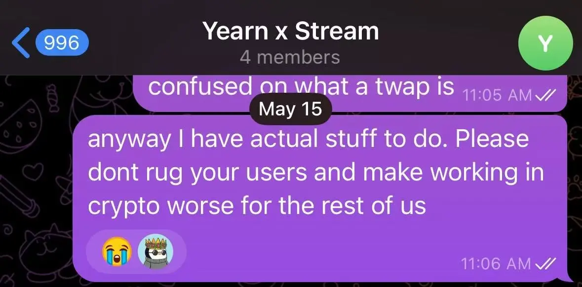 这场风暴并非毫无征兆。早在 172 天前,Yearn 的核心开发者 Schlag 就曾对 Stream 团队发出警告。在风暴眼中心,他更是直言不讳: