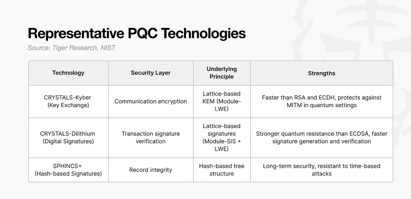 • 后量子密码学在三个安全层面提供针对量子攻击的保护:通信加密、交易签名和数据存续。
