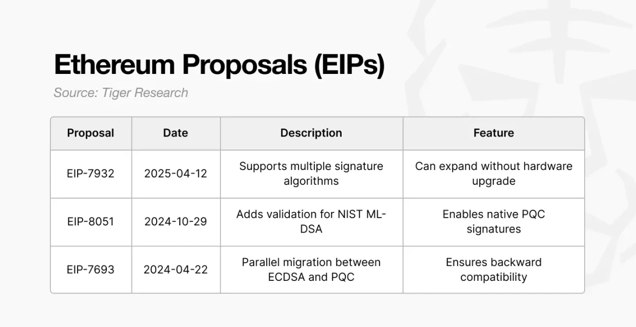 • EIP-7693:引入混合迁移路径,在保持与 ECDSA 兼容的同时,支持逐步过渡到 PQC 签名。