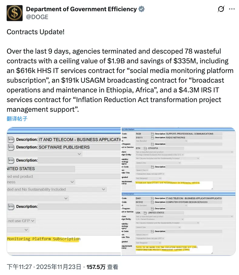 最近的一次推文里,DOGE 表示他们在过去的 9 天里,终止或缩减了 78 份浪费的合同,总价值达 19 亿美元,节省了 3.35 亿美元。