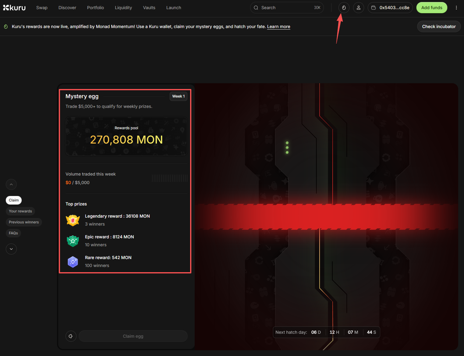 今晨,Kuru 推出 Monad 主网上线的奖励计划(参与链接: https://www.kuru.io/mystery-egg ),每周将平台交易手续费的 25% 以 MON 代币的形式分给平台用户。根据平台显示,第一周只需平台交易量超 5000 美元即可参与,奖池为 27 万枚 MON 代币,三名最幸运的用户将每人获得 3.6 万枚 MON 代币。