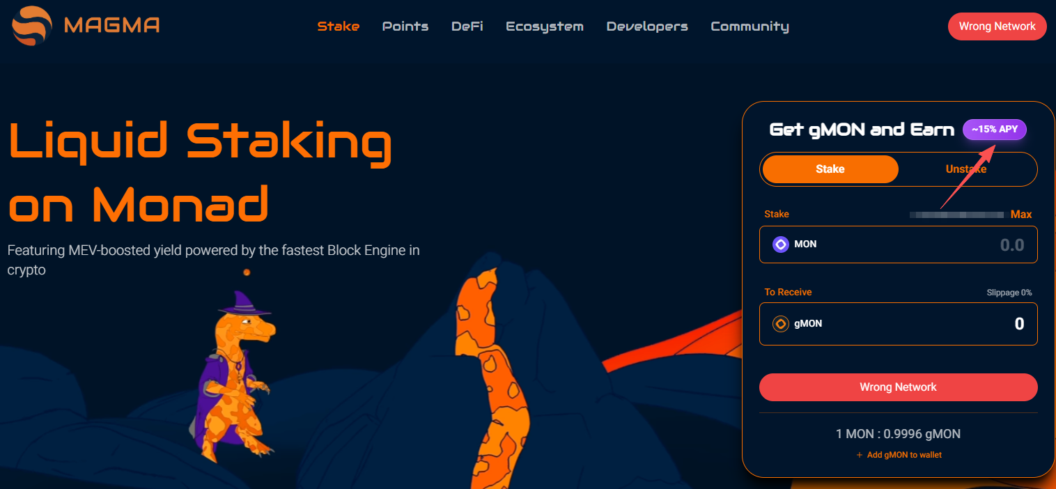Magma 是基于 Monad 区块链的流动性质押协议, 截至目前其融资总金额为 390 万美元。 Magma 现已上线质押 MON 铸造 gMON 积分活动,当前年化收益率为 15%。