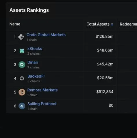 9 月 12 日,链上数据 显示 ,代币化股票板块总锁仓量(TVL)中,Ondo Global Markets 以 1.2685 亿美元位列第一,规模已超过其他平台总和。