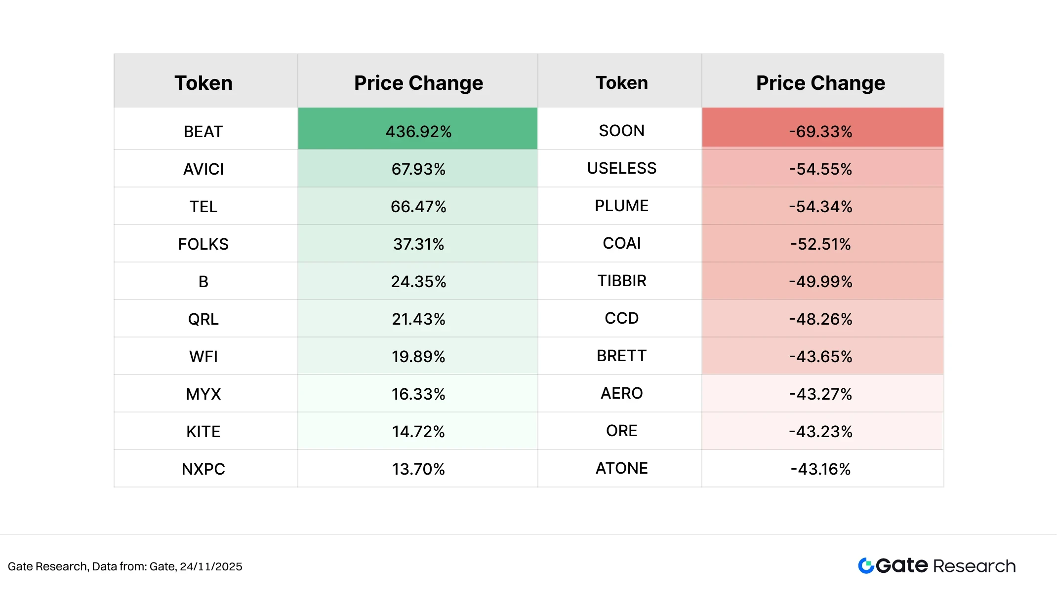 回顾 2025 年 11 月 11 日至 11 月 24 日期间,加密市场在 AI 泡沫疑虑、强劲就业数据与降息预期下修的压力下全面回调,但 BTC 与 ETH 于 11 月 19 至 20 日出现低位技术性修复,行情整体呈震荡筑底结构。链上资金同步进入再分配阶段,Arbitrum 持续获得增量流入,Solana、Base 等生态回暖,而以太坊主网与 Hyperliquid 资金外流明显;股票与 ETF 的链上化规模逼近 1,000 万美元,推动 Arbitrum 加速向机构级结算枢纽靠拢。市值前 500 名代币平均下跌约 15%,中大盘(市值 100–200)跌幅最深,而中小市值波动最为剧烈,BEAT 录得 436% 成为最强弹性标的,AVICI、TEL 等题材币同步走强;SOON、USELESS、PLUME 等前期过热资产则回落 50–70%,体现“高 Beta 退潮、结构性分化”特征。