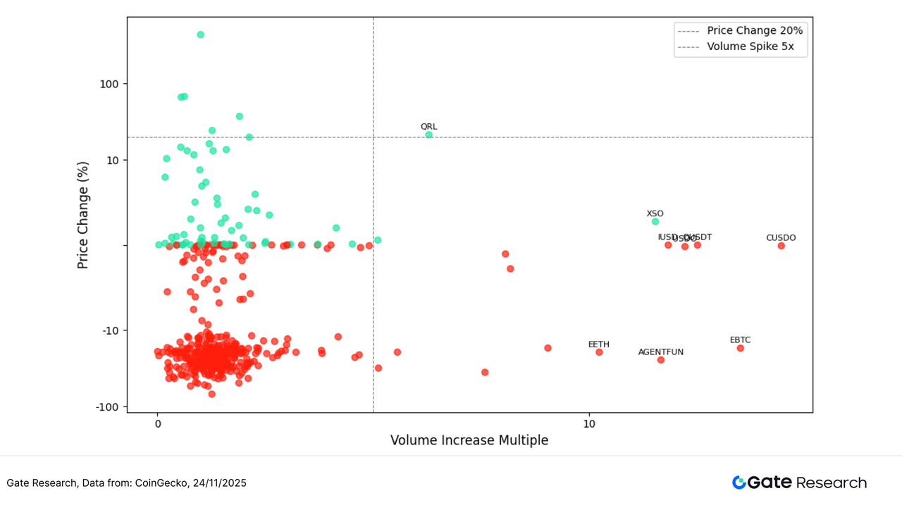 在延续成交量异动项目的观察基础上,本文进一步结合价格表现,绘制了成交量增长倍率(Volume Increase Multiple)与价格涨跌幅(Price Change %)的散点分布图。横轴代表代币在过去两周成交量相较基准期的增长倍数,纵轴为同期价格变动百分比,并采用对称对数坐标轴,以清晰呈现“放量”与“涨跌”间的结构关系。