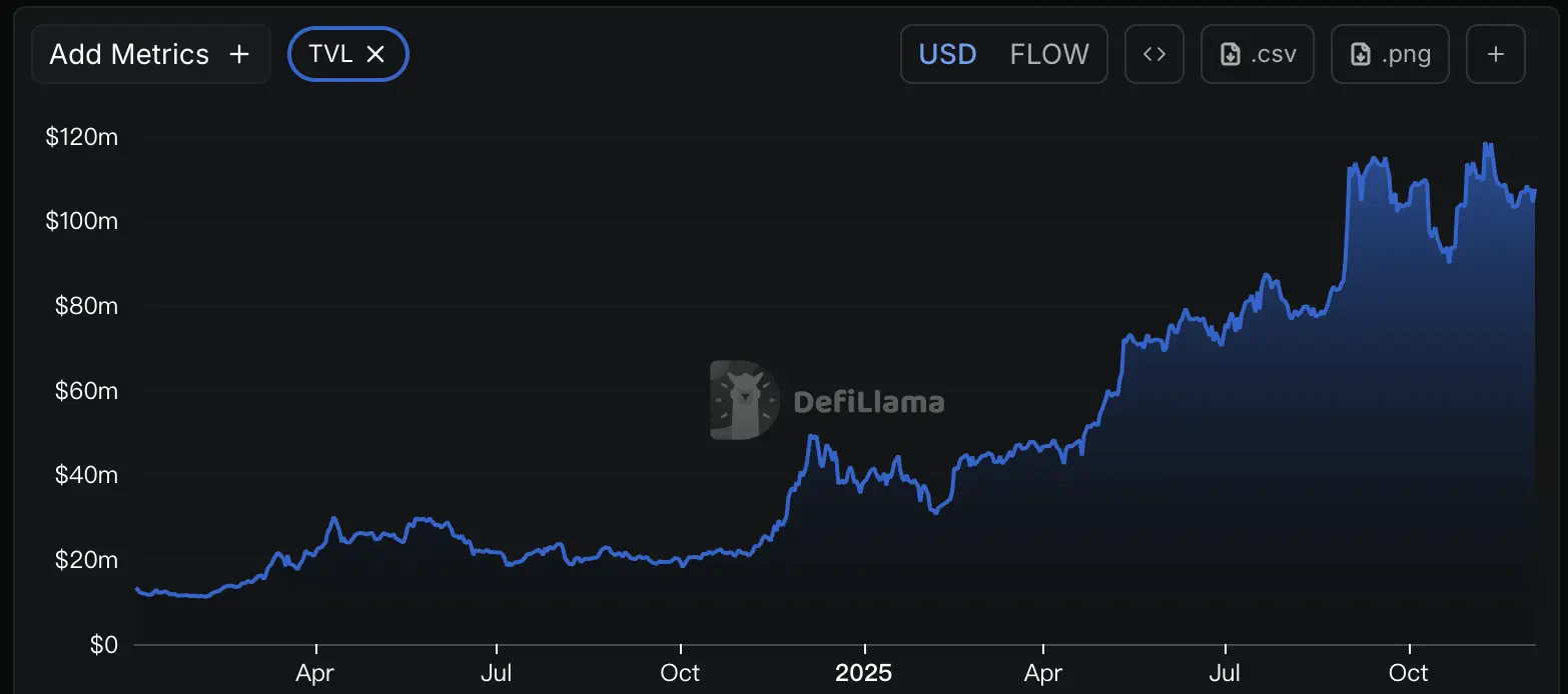 Flow 目前擁有 4100 萬個總賬戶,但月活躍使用者為 110 萬,總鎖定價值(TVL)達 $107 百萬,同比增長 187.1%。這些數字反映出 Flow 在恢復生態活力方面的努力已經取得初步成果。