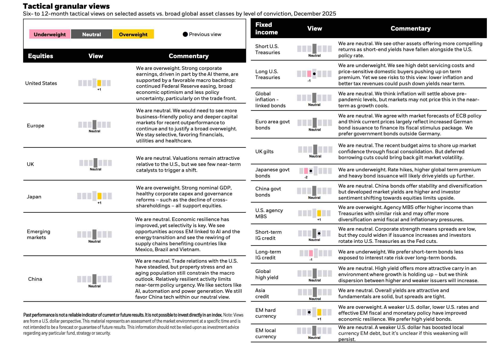 • 美国股市(超配) :强劲的企业盈利(部分由 AI 主题驱动)叠加良好的宏观背景都将支持美股表现;