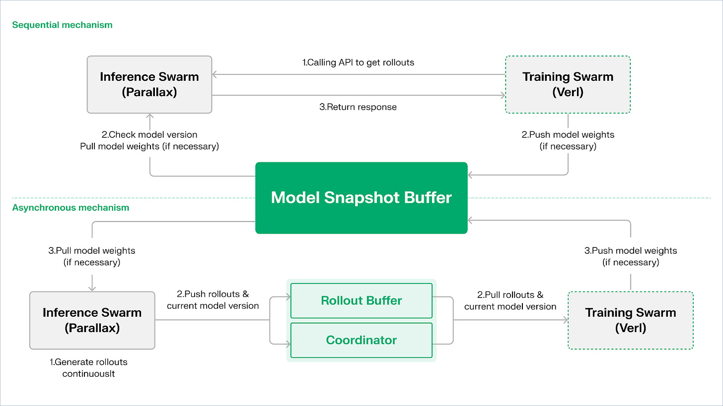 三者共同组成一个 P2P 的 RL 组织结构,无需中心化调度即可完成大规模协作学习。