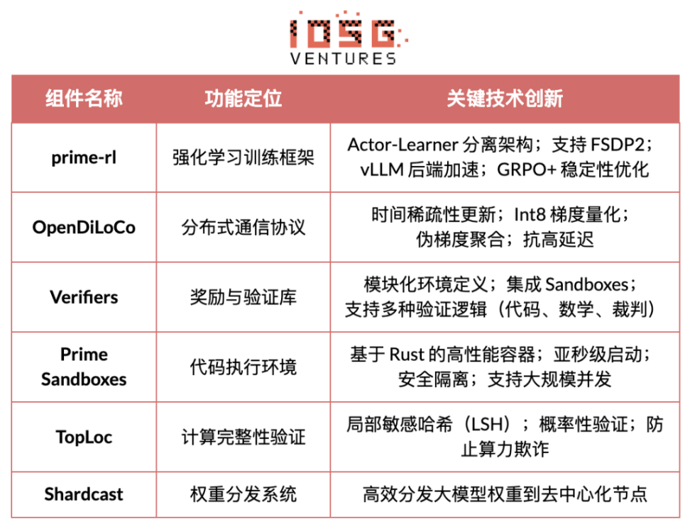 Prime Intellect 核心基础设施组件 prime-rl 框架专为异步分布式环境设计与强化学习高度相关,其余包括突破带宽瓶颈的 OpenDiLoCo 通信协议、保障计算完整性的 TopLoc 验证机制等。