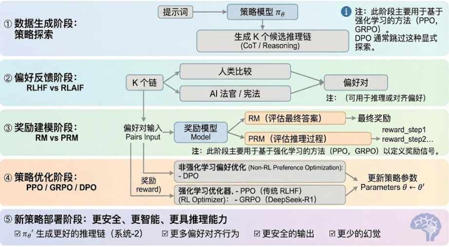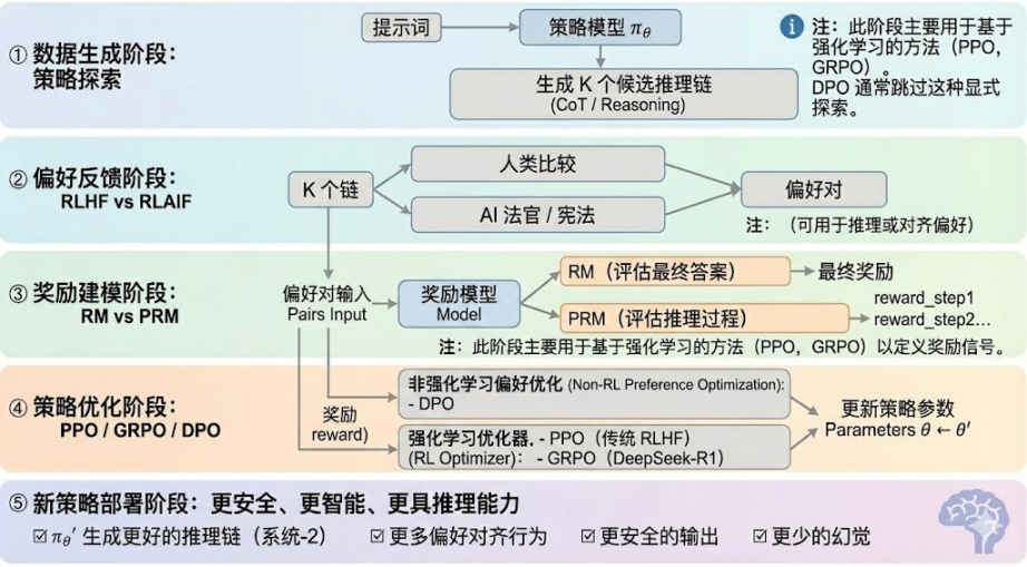 - 新策略部署阶段(New Policy Deployment):经过优化后的模型表现为:更强的推理链生成能力(System-2 Reasoning)、更符合人类或 AI 偏好的行为、更低的幻觉率、更高的安全性。模型在持续迭代中不断学习偏好、优化过程、提升决策质量,形成闭环。