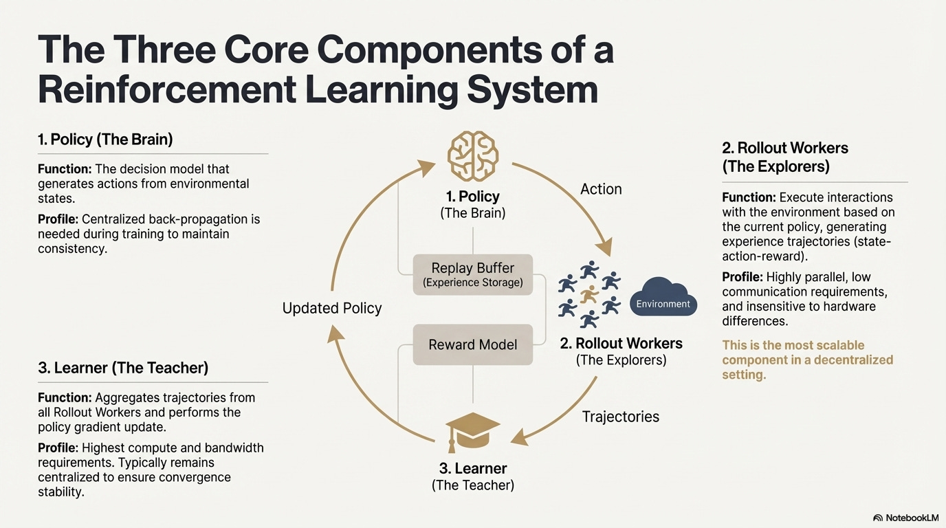 「推理—训练解耦」天然契合去中心化的异构算力结构: Rollout 可外包给开放网络,通过代币机制按贡献结算,而模型更新保持集中化以确保稳定性。