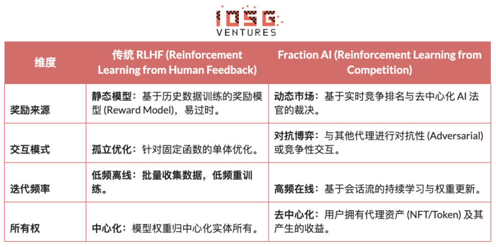 传统 RLHF 与 Fraction AI 的 RLFC 之间的核心差异: