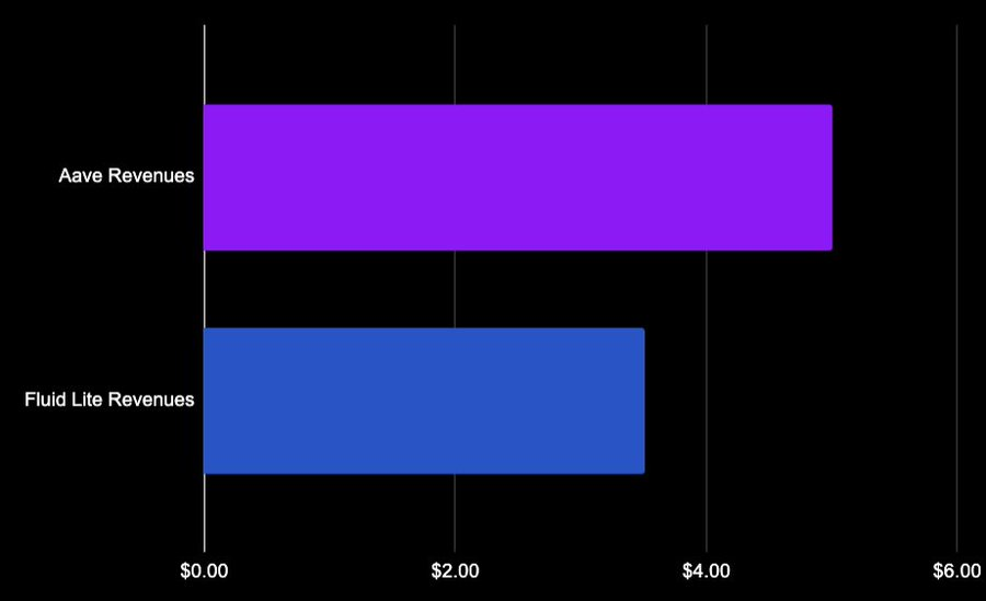 Fluid Lite ETH: 20% 绩效费 + 0.05% 退出费,不收平台管理费。从 Aave 借入 17 亿美元 wETH,支付约 3300 万美元利息,其中约 500 万美元归 Aave,Fluid 自身收入接近 400 万美元。