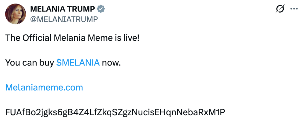 年初美國新任總統川普發行 Meme 幣 TRUMP 的事情可謂人盡皆知,之後川普夫人梅蘭妮亞與阿根廷總統米雷也先後於北京時間 2025 年 1 月 20 日和 2 月 15 日在個人社群媒體上宣傳與他們有關的 MELANIA 與 LIBRA 代幣(米雷發布的推文已刪除)。