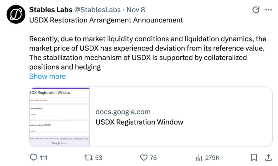 更可怕的是,兩個可疑地址中有一個與 USDX 發行方 usdx.money 創始人 Flex Yang 直接相關,創始人都在著急套現,除了專案已經出現問題,還有其他解釋嗎?就在筆者文章發出後的當晚,USDX 開始出現嚴重的脫錨,驗證了專案確實出現了問題的論斷。之後的 11 月 8 日,Stables Labs 發推稱將根據現有資源情況幫助受損失的用戶,並開放了登記渠道,但這也是 Stables Labs 至今為止的最後一條推文,實質進展如何,我們不得而知。
