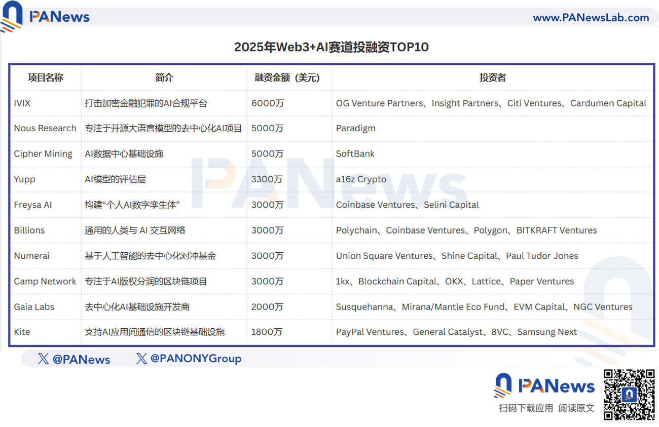 在资金规模上,获得千万美元资金的AI项目在2025年占比达26.12%,大幅超过2024年的15.2%,整体呈现出稳中有进的发展态势。2025年8月,打击加密金融犯罪的AI合规平台IVIX完成6000万美元B轮融资,创下该赛道单笔融资规模的最高记录。