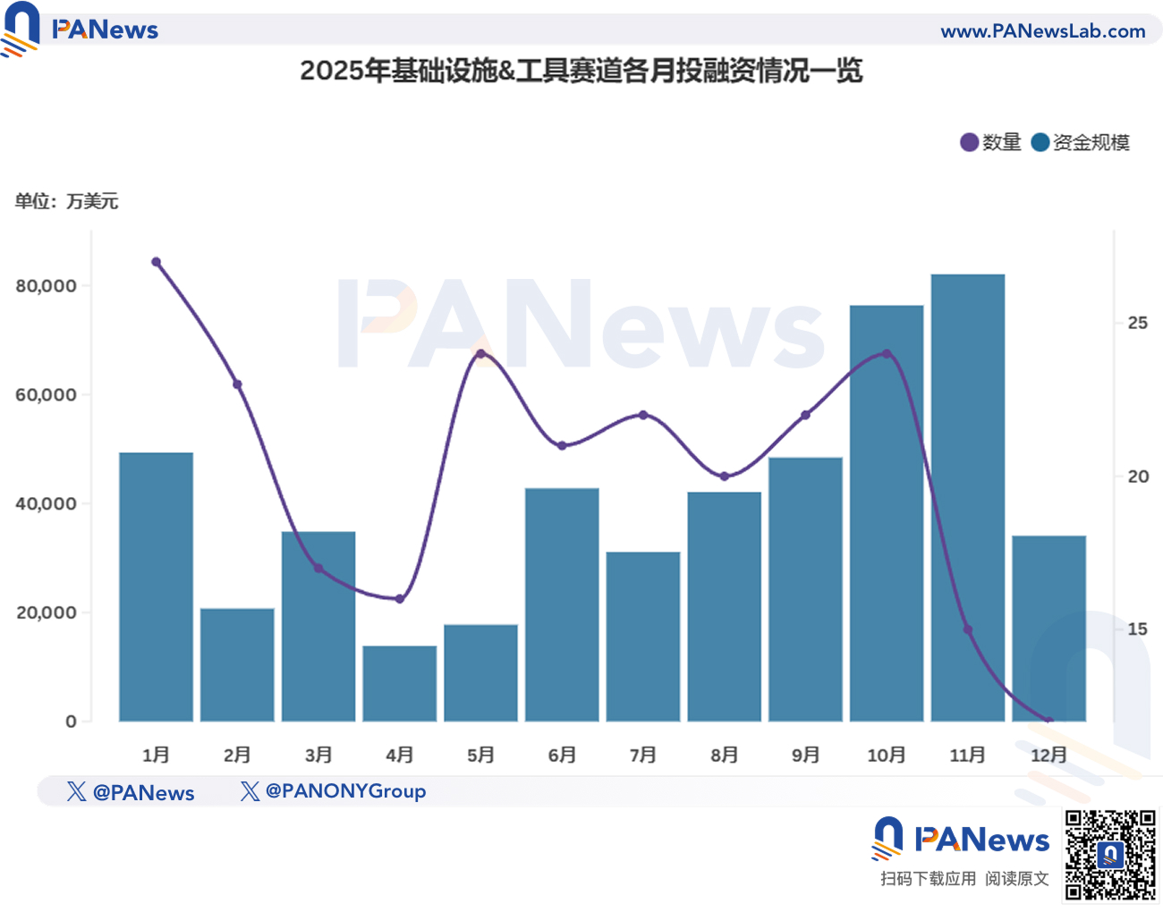 2025年,基础设施与工具赛道累计公布了243起投融资事件,共筹集超49亿美元,平均融资金额约为2030万美元。